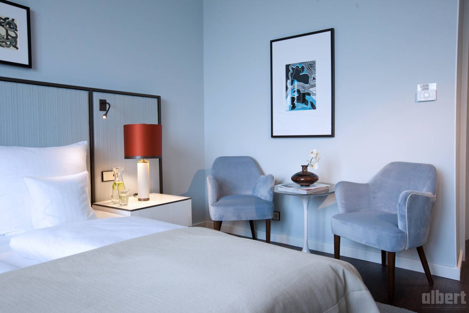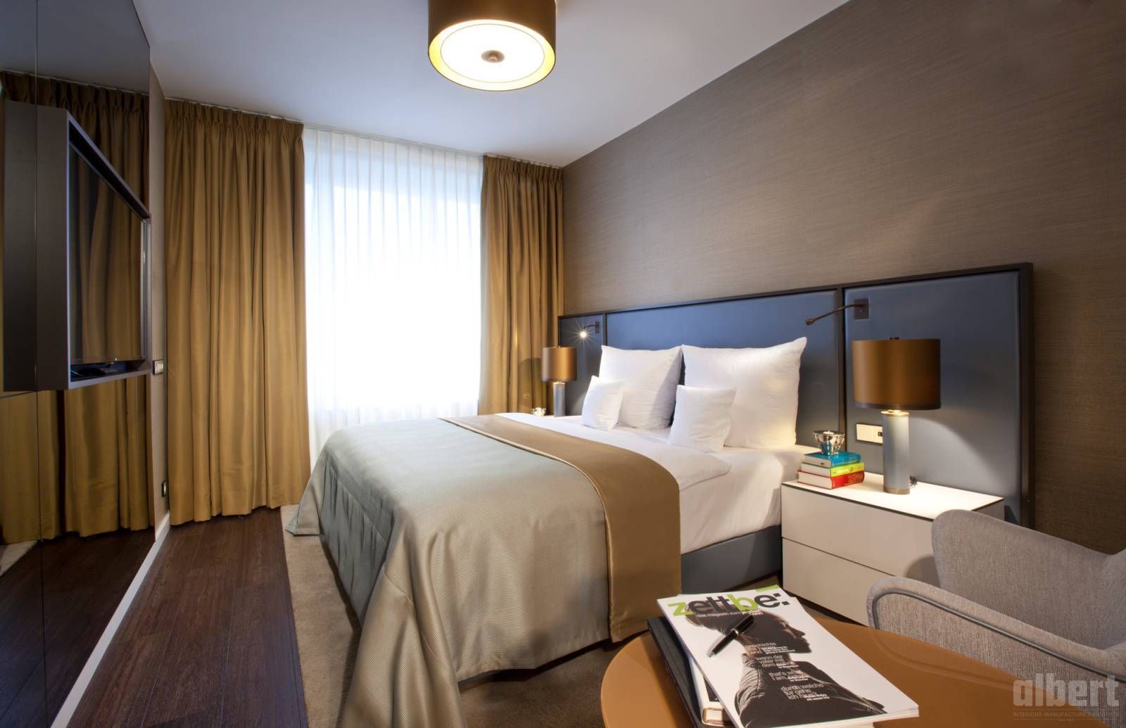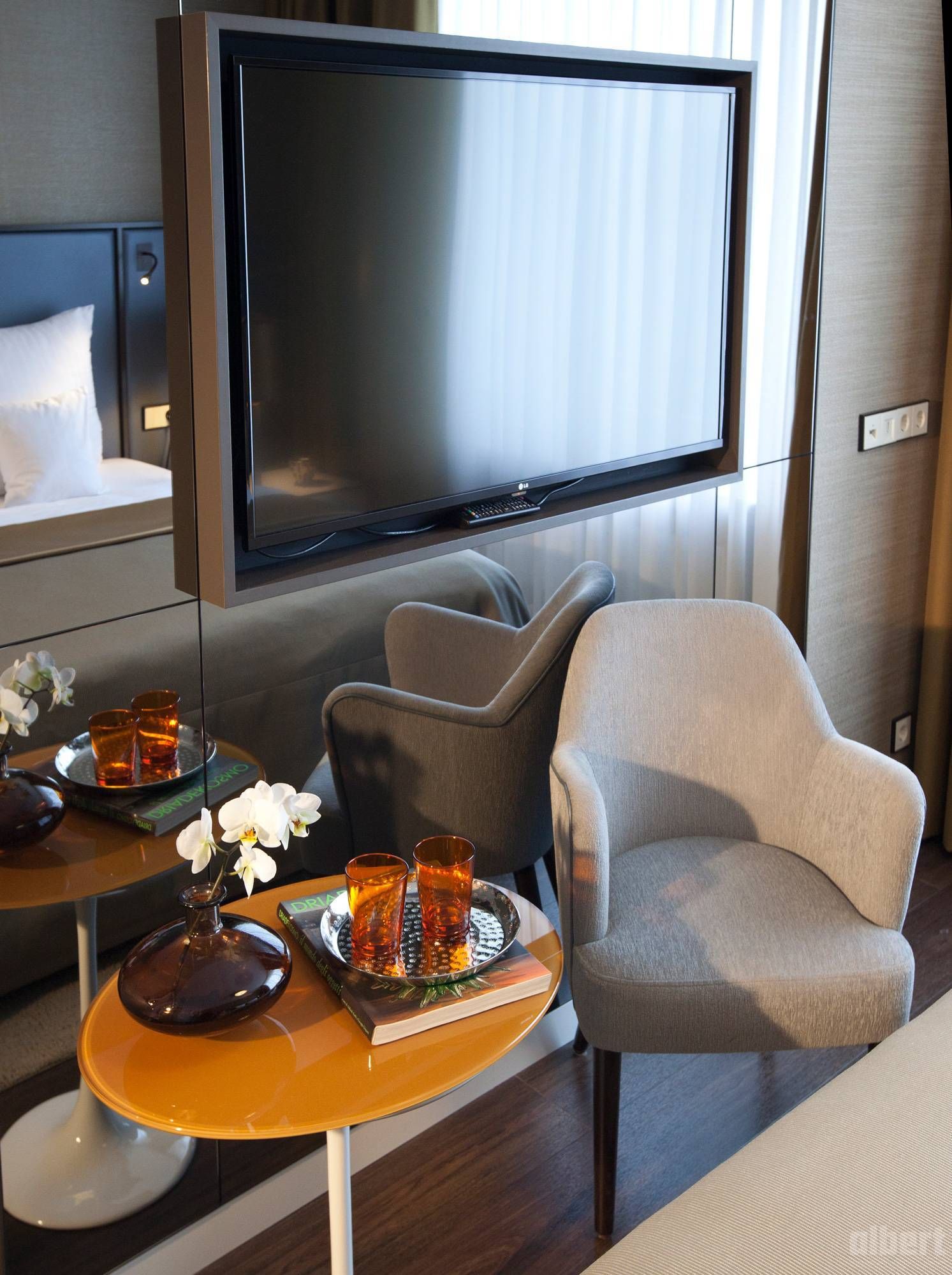 albert verantwortete den Ausbau von Zimmern, Restaurant, Rezeption und Tagungsräumen und schuf damit Bereiche, die trotz ihrer sehr unterschiedlichen Funktion eine gemeinsame gestalterische Haltung teilen: zurückgenommen, hochwertig und präzise in der Ausführung, abgestimmt auf ein internationales Gästepublikum mit hohem Anspruch.